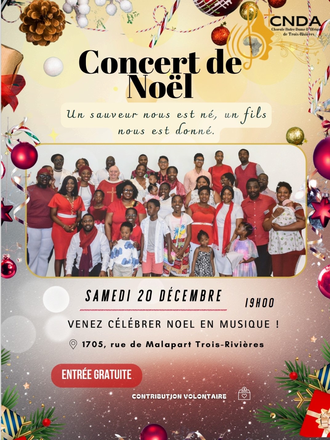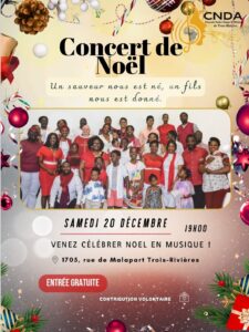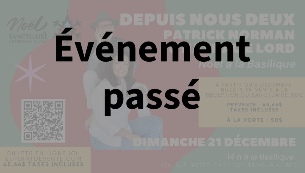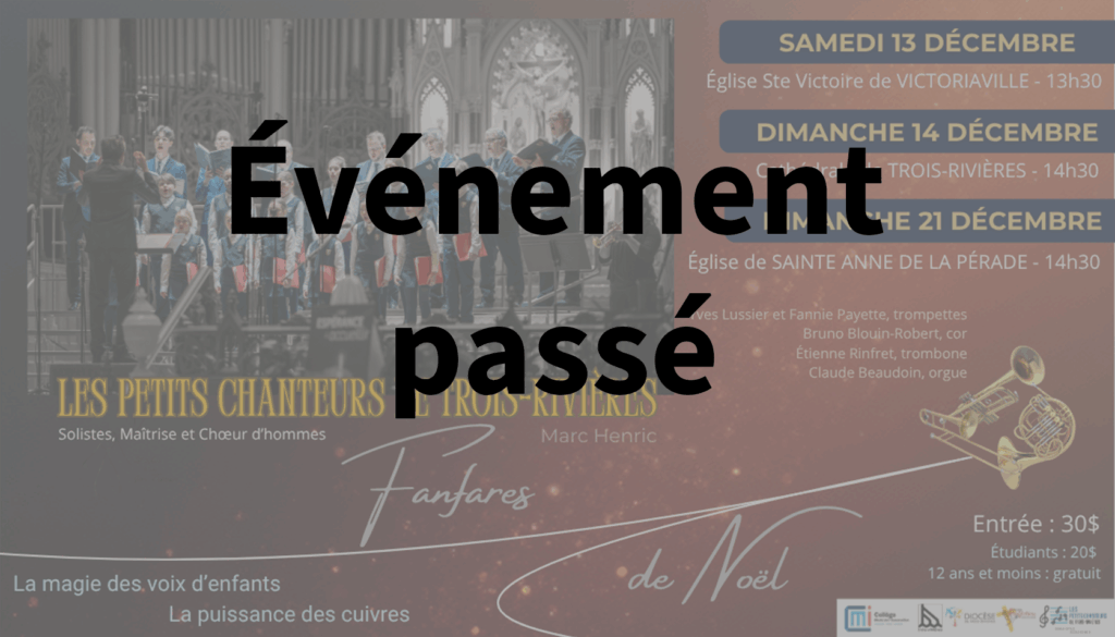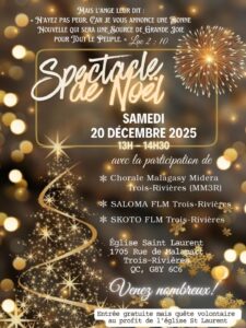 Par Communication / 19 novembre 2025 Spectacles de Noël Tous les spectacles des quatre coins du diocèse, répertoriés au même endroit ! Billets : Achat physique ou par téléphone Dimanche 7 décembre – Chorale Chant de l’heure à l’église Sainte-Thècle Samedi 13 décembre – Chœur Pro-Musica au Séminaire Saint-Joseph à Trois-Rivières Dimanche 14 décembre – Chorale Joie de vivre à l’église Sainte-Flore Dimanche 14 décembre – Chorale Chœur du Roy au Séminaire Saint-Joseph à Trois-Rivières Vendredi 19 décembre – Chœur des Amis de Jésus à la cathédrale Samedi 20 décembre – Les Familles des Îles (Québec/Maurice) à la cathédrale Samedi 20 décembre – FML3R à l’église Saint-Laurent Samedi 20 décembre – CDNA à l’église Saint-Laurent Billets : Achat en ligne (cliquez sur les images pour les informations)